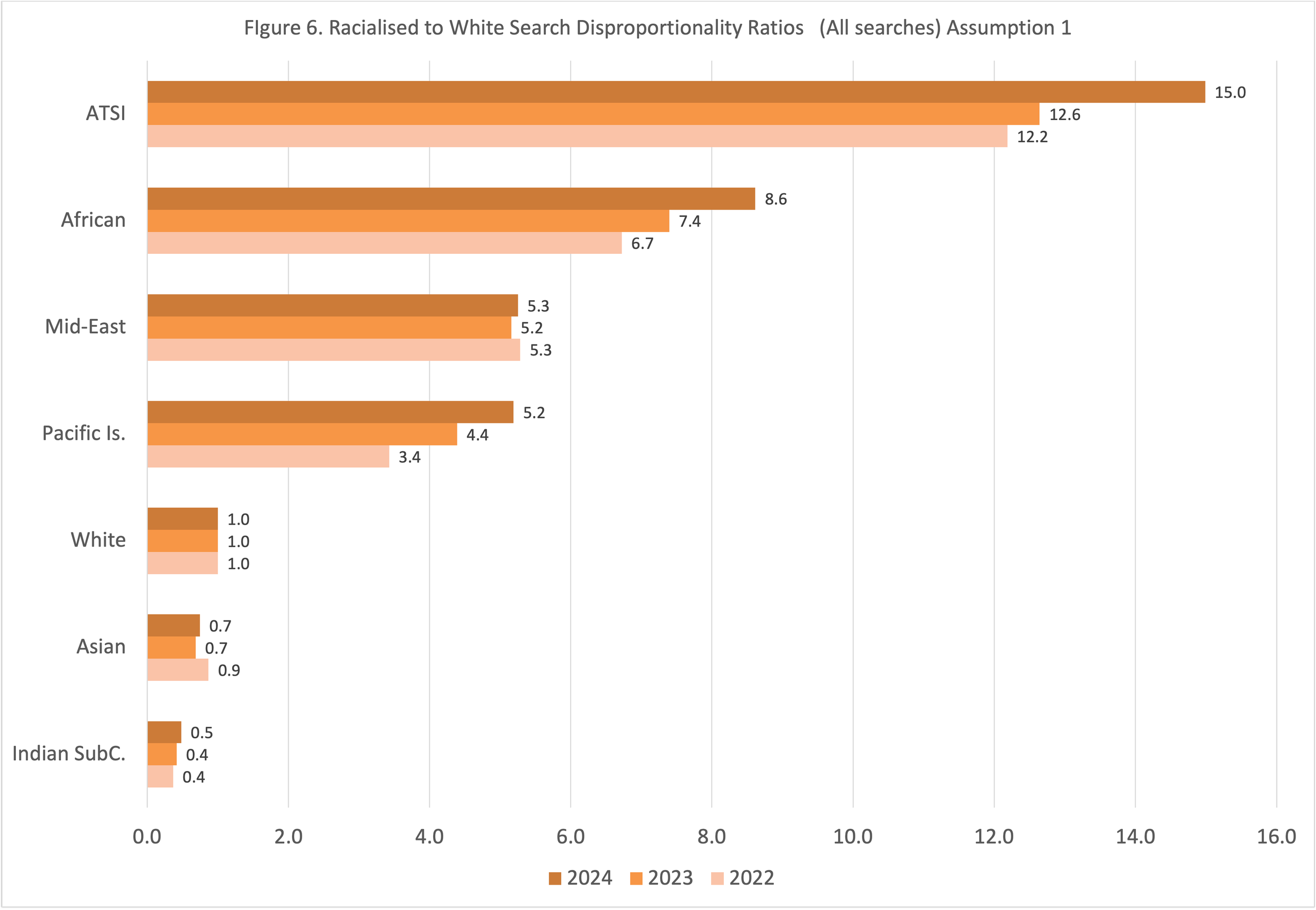 Figure 6 provides preliminary evidence that in 2024 Aboriginal and Torres Strait Islander Victorians are approximately 15 times more likely to be searched that white people. People who police perceive to be African are almost 9 times more likely that white people to be searched. People who police perceive to be Middle-Eastern are about 5 times more likely to be searched than white people, and people who are perceived by police to be Pacific Islanders are 5 times more likely to be searched than white people.
