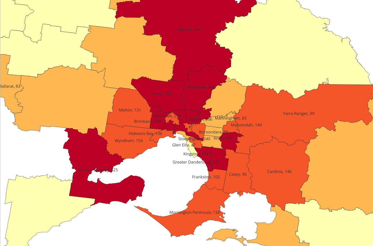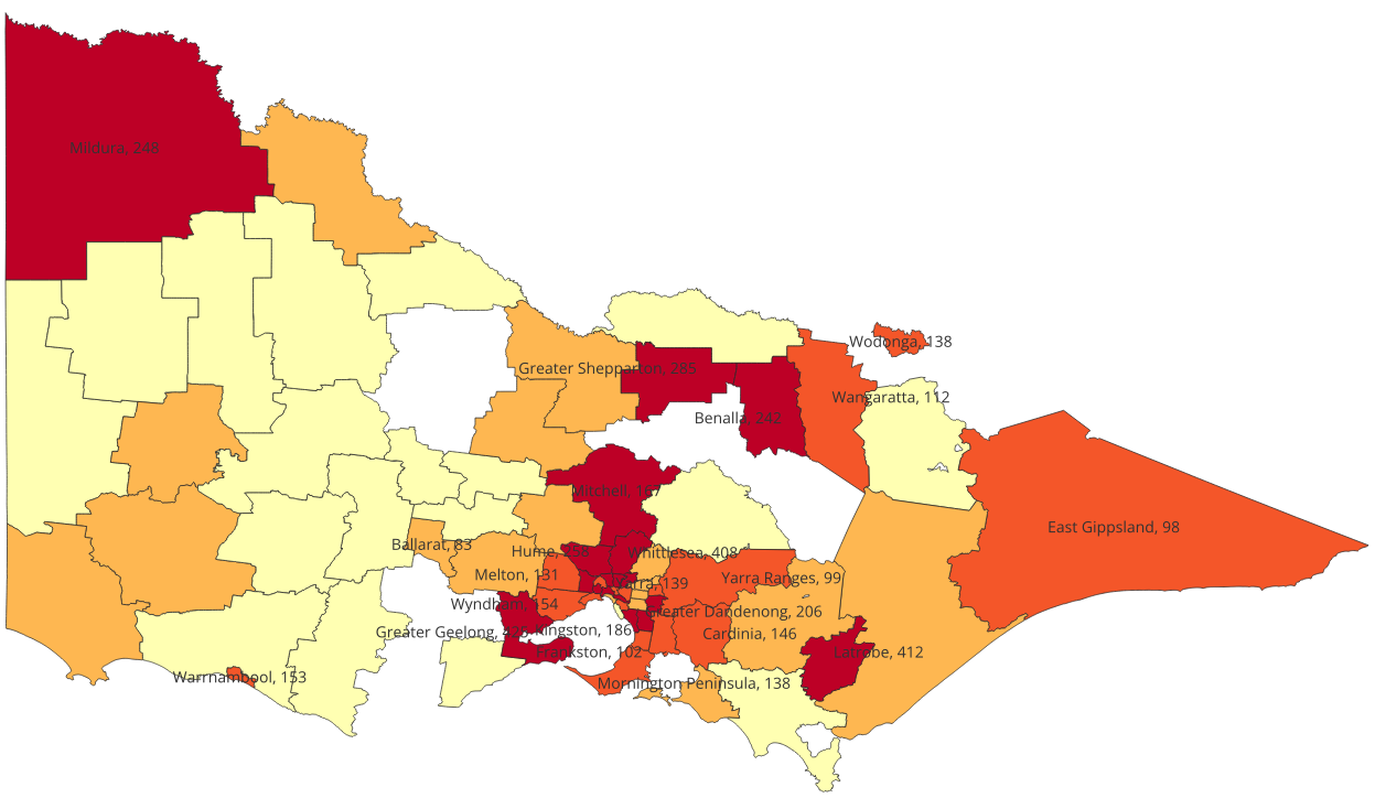 Map 1 shows the location of all searches in Victoria in 2024, where location can be identified from the name of the police operation. Please note this data includes all searches listed on police L19C forms, but does not include Designated Area Searches. In the map, the quartiles density quartiles are red (161-425), orange (83-161), dark yellow (38-83) and light yellow (1-38)