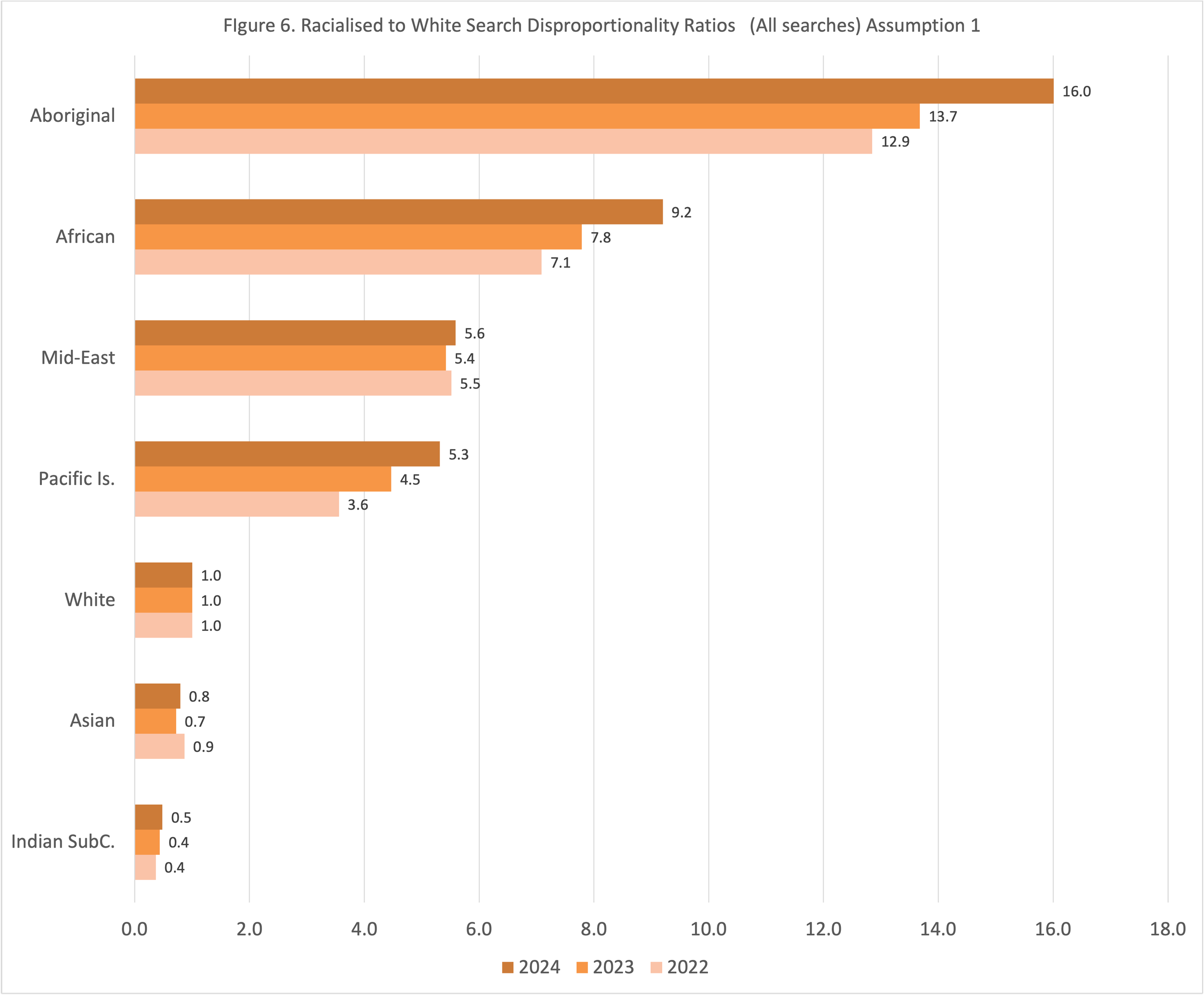 In 2024, when compared with people perceived to be White people, people perceived to be Aboriginal and Torres Strait Islanders are 16 times more likely to be searched than White people, people police perceive to be African are 9 times more likely to searched, people the police perceive to be Pacific Islanders are 5 times more likely to be searched and police the police perceive to me Middle-Eastern are almost 6 times more likely to be searched than people perceived to be White.