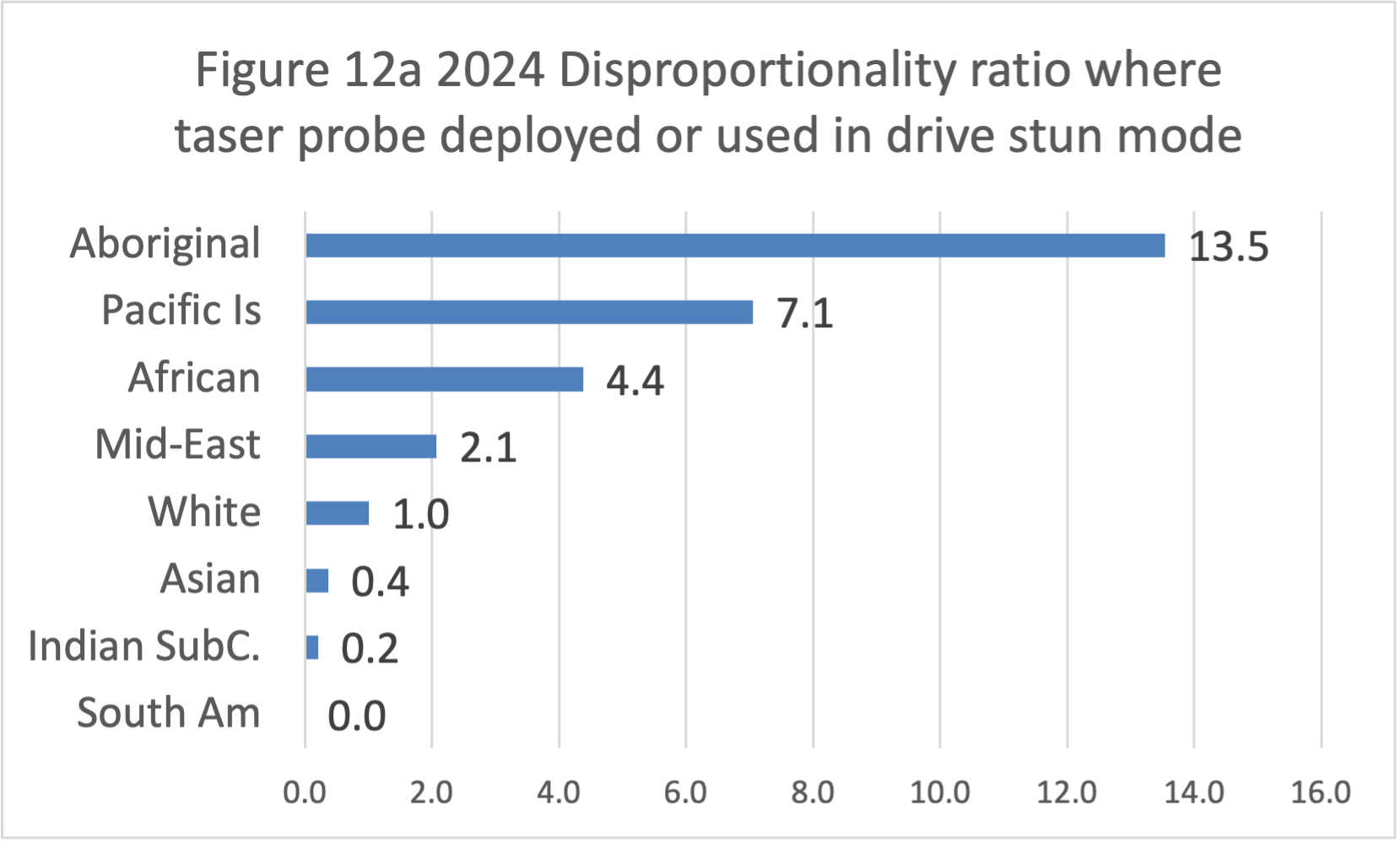In 2024, Victoria Police recorded the use of tasers in either drive stun mode or with probes deployed in 153 cases where ethnicity was also recorded (that is in 153 of a total of 171 cases). The disproportionality ratio (racialised to white) in these cases can be seen in Figure 12a below. Aboriginal people are 13.5 more likely to subject to actual taser deployment than white people. Pacific Islanders are the targets of 7.1 times more actual taser use than white people.